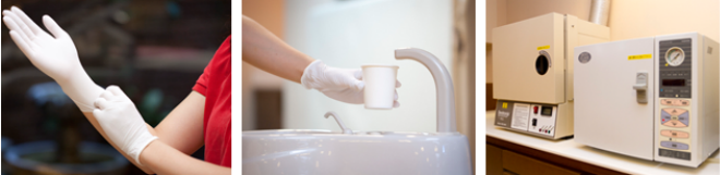 当院ではコップや手袋からラバーカップまで、可能な限りディスポーサブル(使い捨て)を徹底しています。使用するミラーやピンセットは、滅菌パックに入れて滅菌し、そのパックを患者さんの前で開封いたします。また、器材に応じて、高圧蒸気滅菌器、乾熱滅菌器、薬液滅菌などを的確に使用していますので、院内感染を心配せずに、安心して治療を受けていただけます。