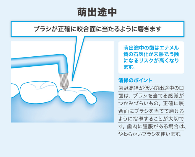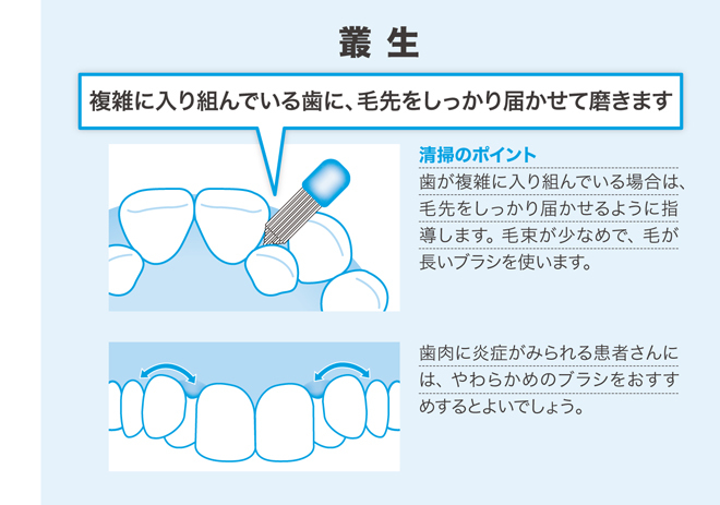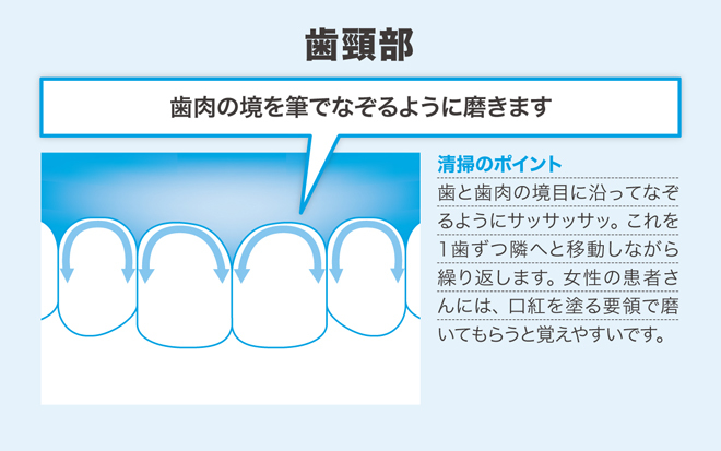 来院時にもお口の中の清掃状態を確認し、専用器具によるクリーニングや清掃方法をアドバイスしています。