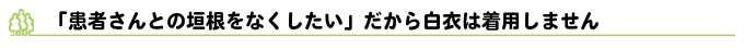 患者さんが少しでもリラックスし、ドクターとの垣根を感じることなく治療を受けていただくために。 当院では、服装にも配慮を行なっています。